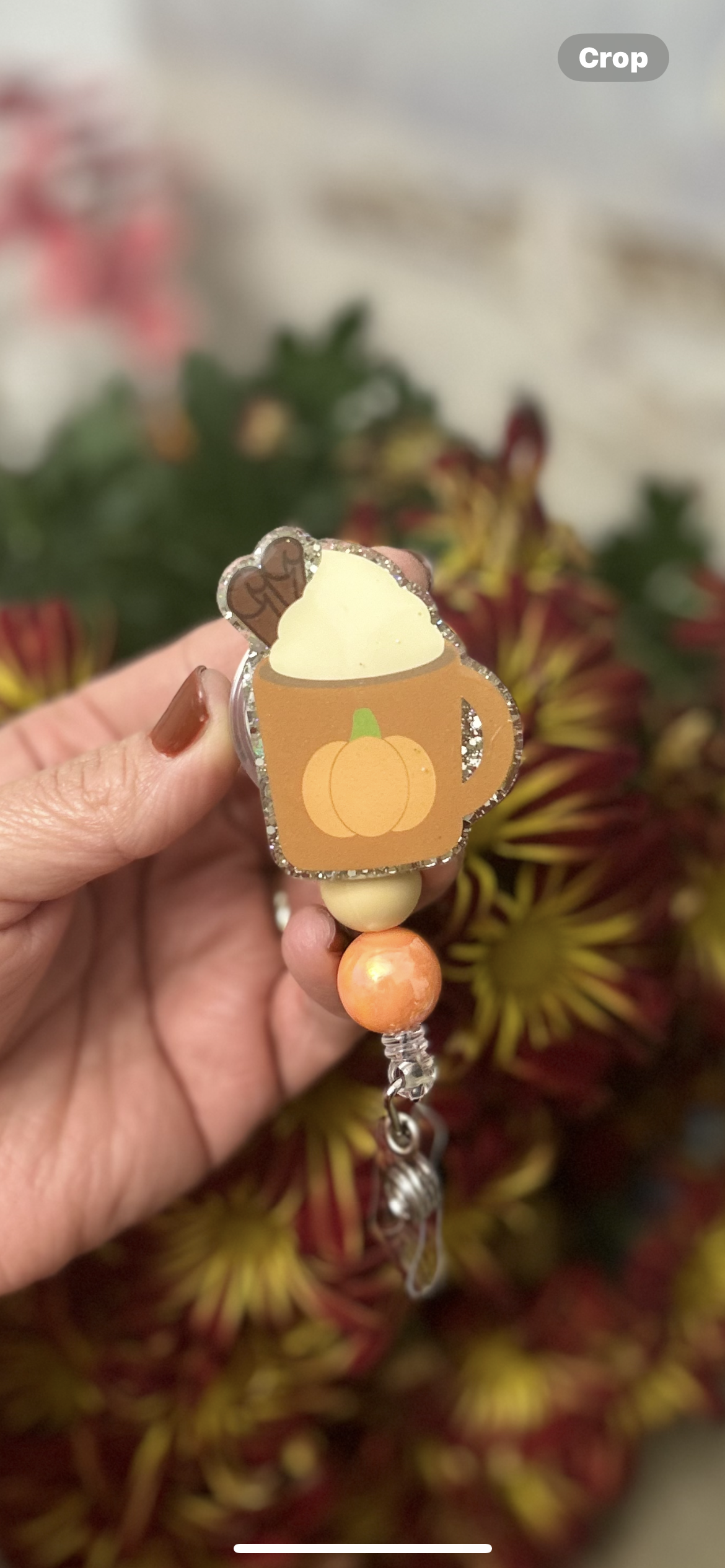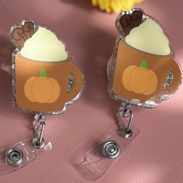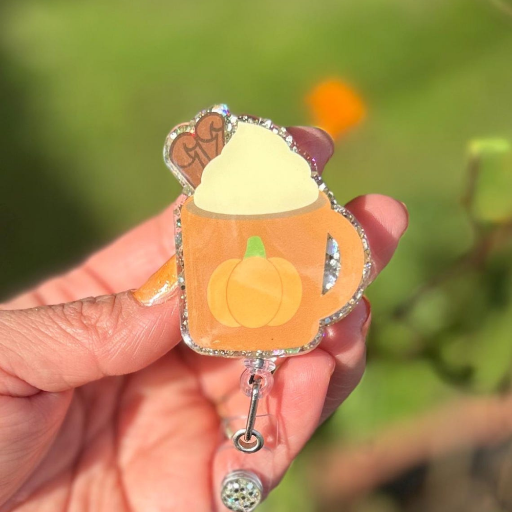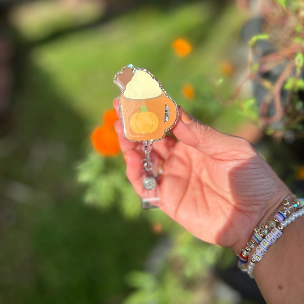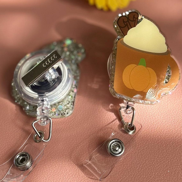 Embrace the cozy vibes of autumn with this handmade Pumpkin Spice Latte badge reel! Perfect for nurses, teachers, and office staff, this glittery, retractable badge holder adds a touch of fall to your workday. Crafted with love, it features a unique resin design, sparkling glitter accents, and durable acrylic material.