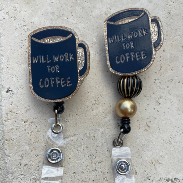 ☕ Add some caffeine-inspired charm to your workday with our 'Will Work for Coffee' Badge Reel! Handcrafted from scratch with resin and fine glitter, this coffee-themed badge reel is the perfect gift for nurses, doctors, and coffee lovers in the healthcare field. The cute coffee cup design adds a touch of personality to your daily routine.