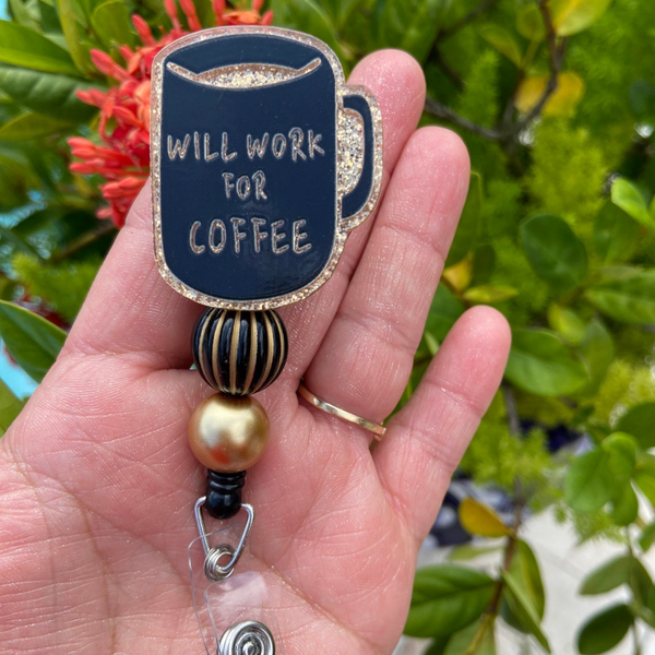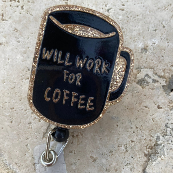 Brew up some fun at work—order your 'Will Work for Coffee' Badge Reel today! ☕✨