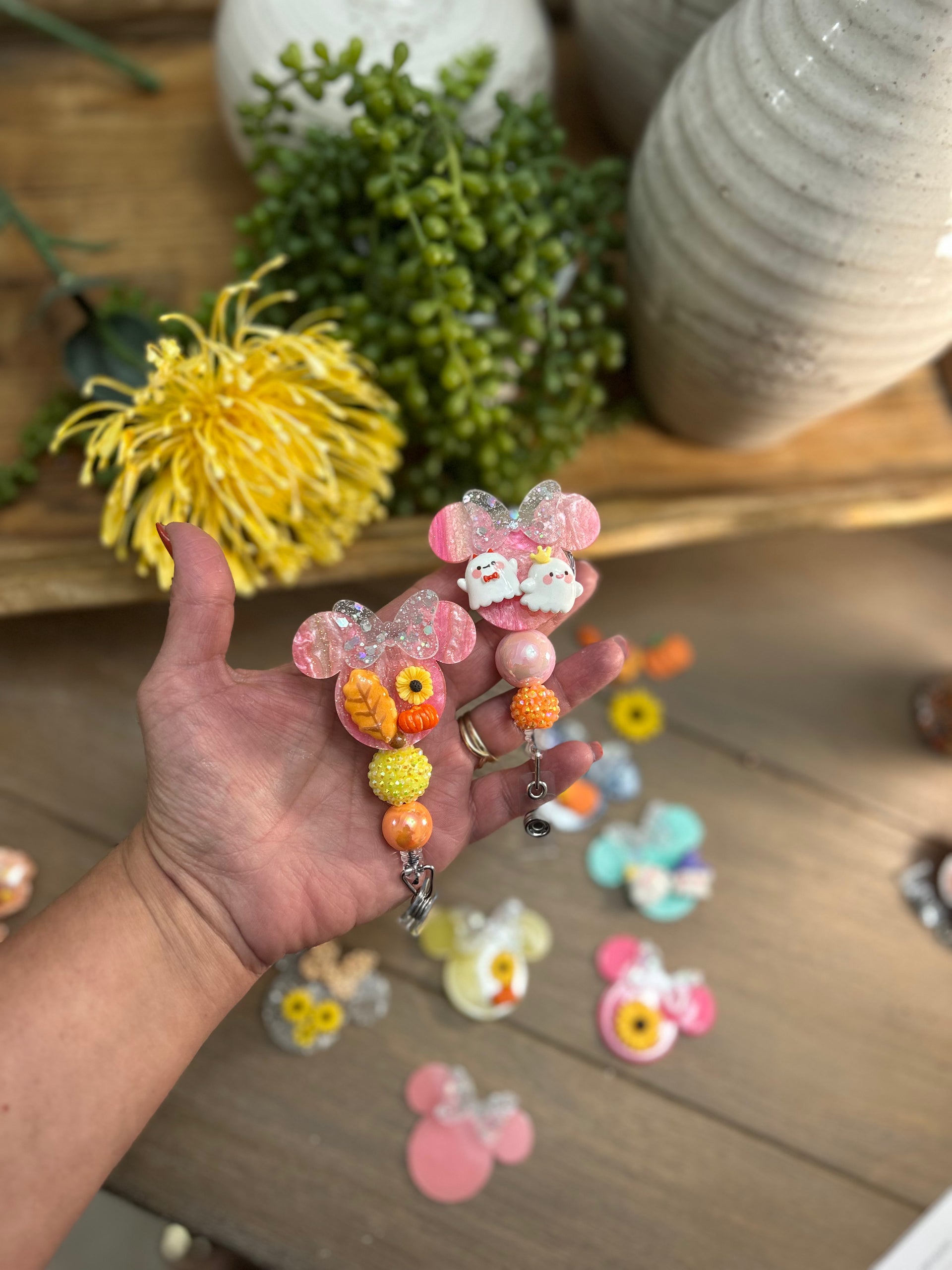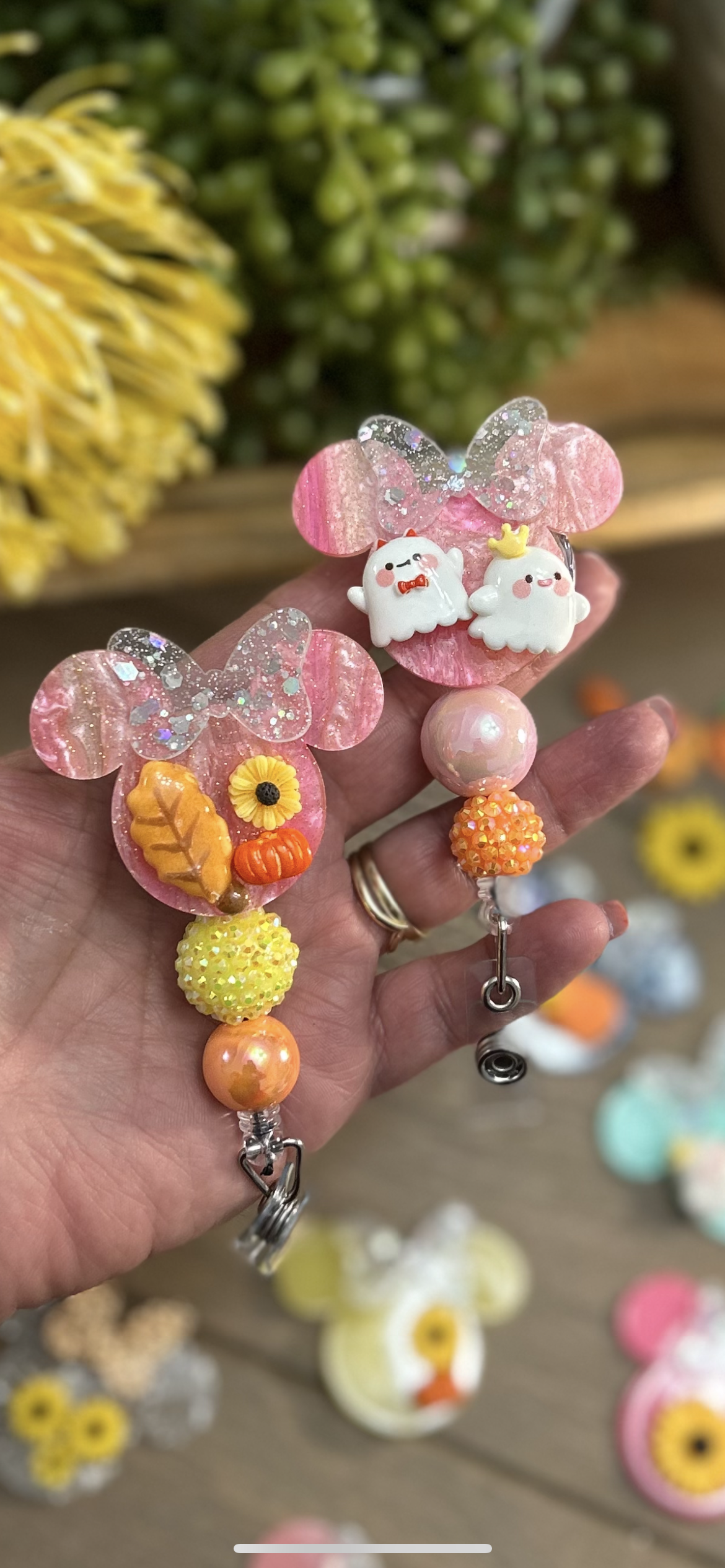 Each reel is crafted with a sparkly pink M Β base, glittery resin bow, and playful 3D decorations featuring pumpkins, leaves, sunflowers, and the cutest little ghosts. π