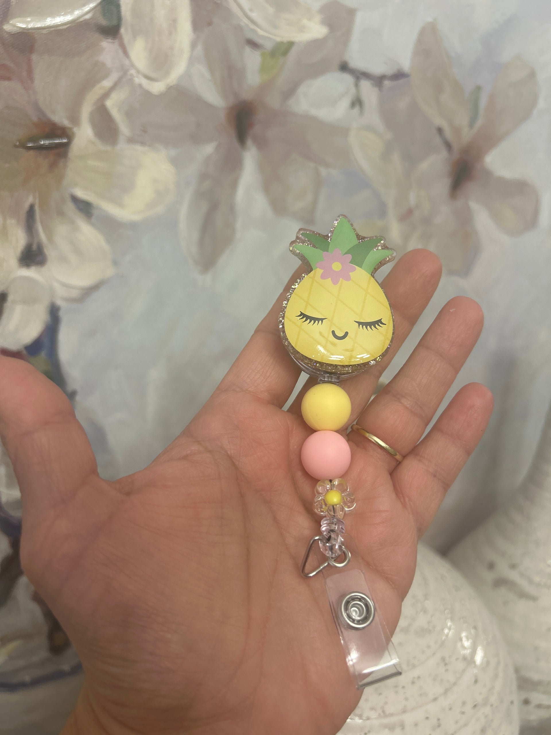 Brighten your shift with this super sweet pineapple badge reel! This cheerful little pineapple is smiling her way through the day, featuring sparkly glitter edges, dreamy lashes, and a pink flower on top. The beaded chain includes soft pastel yellow and pink beads, topped off with a dainty acrylic daisy for that extra sunny touch!