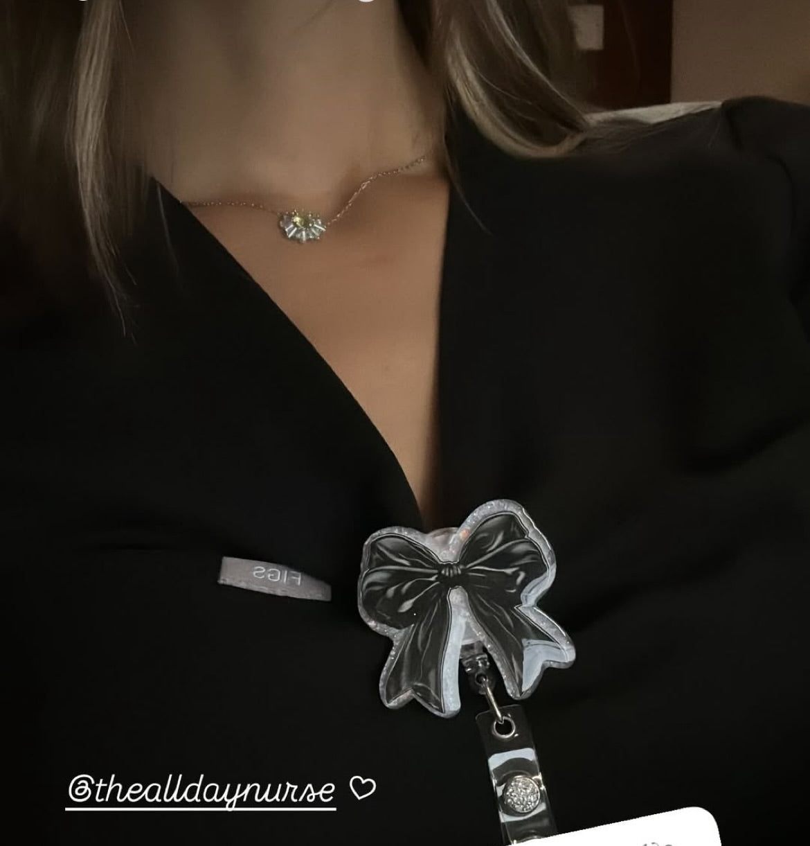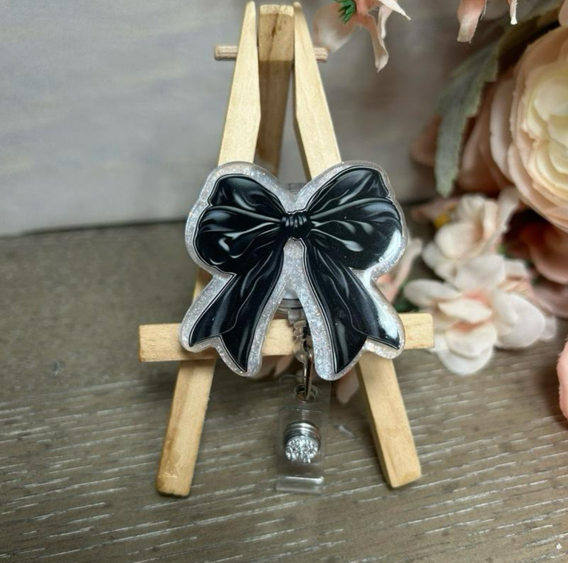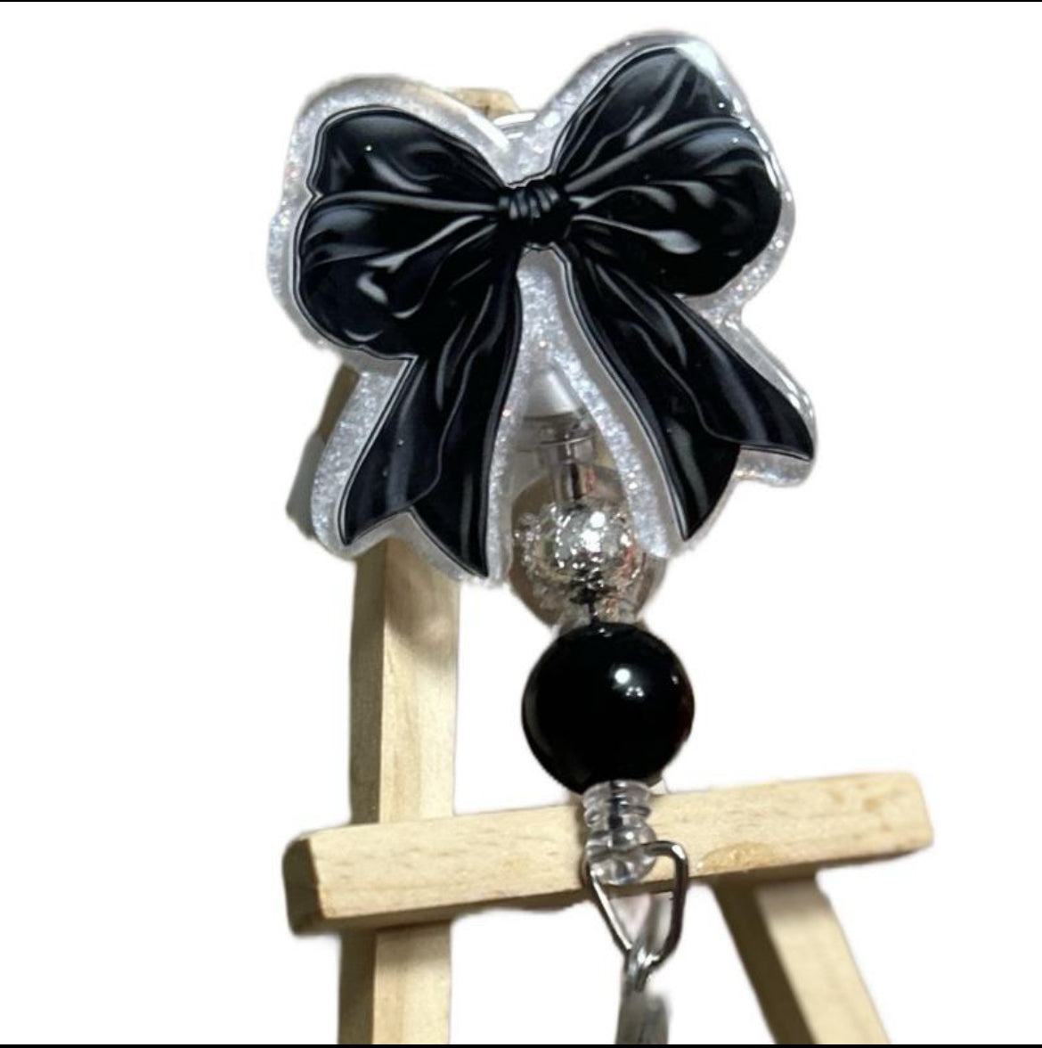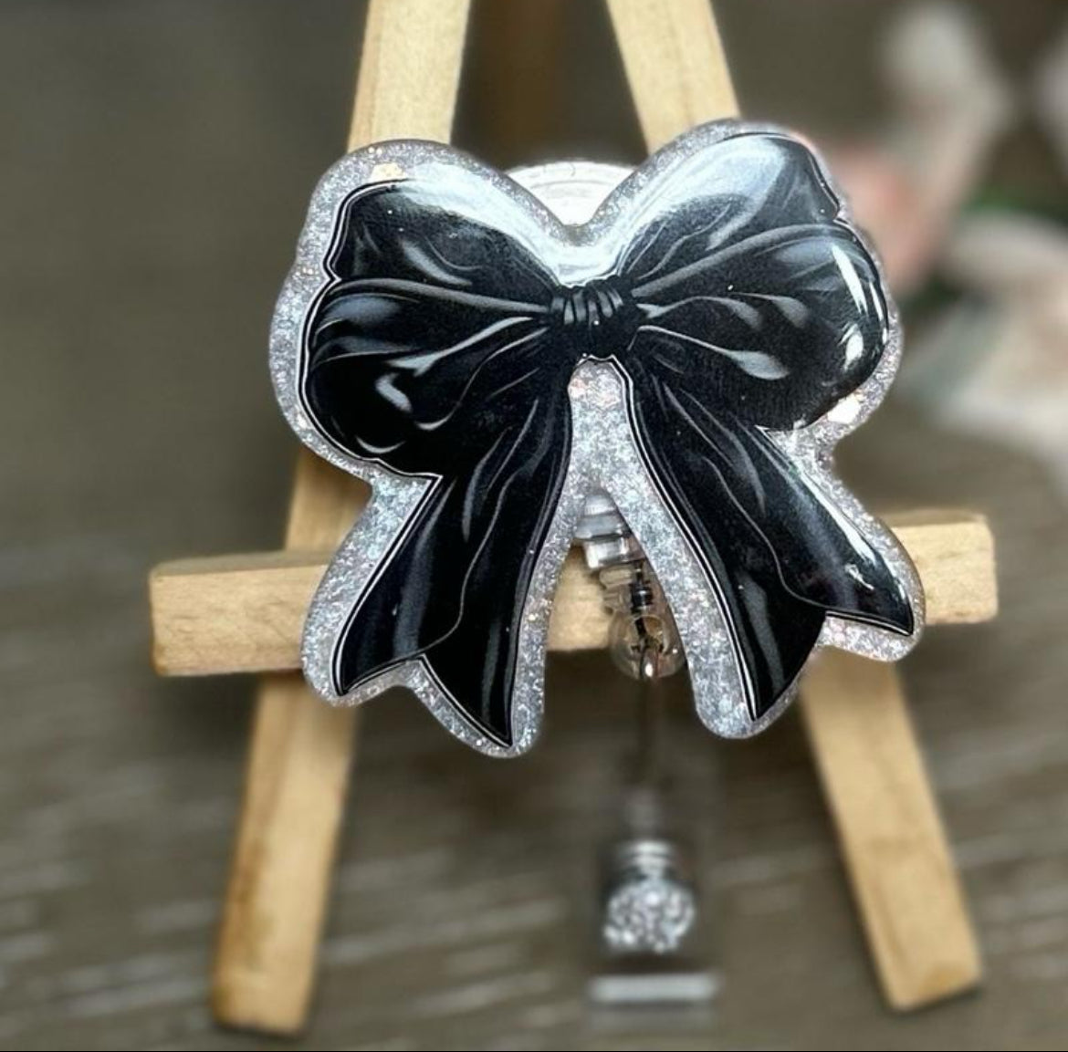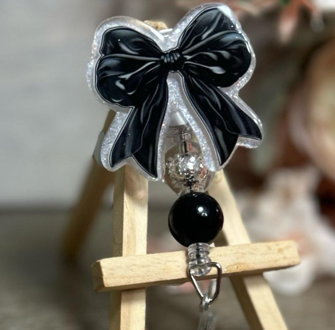 Add a touch of class to your workday with our Elegant Black Bow badge reel! This stunning design features a glossy black bow on a sparkling glitter background, accented with a silver rhinestone bead and a sleek black bead for the perfect glam look.