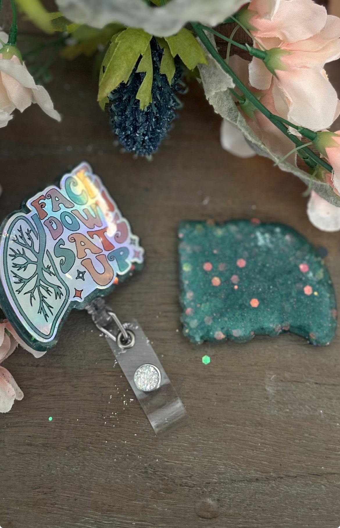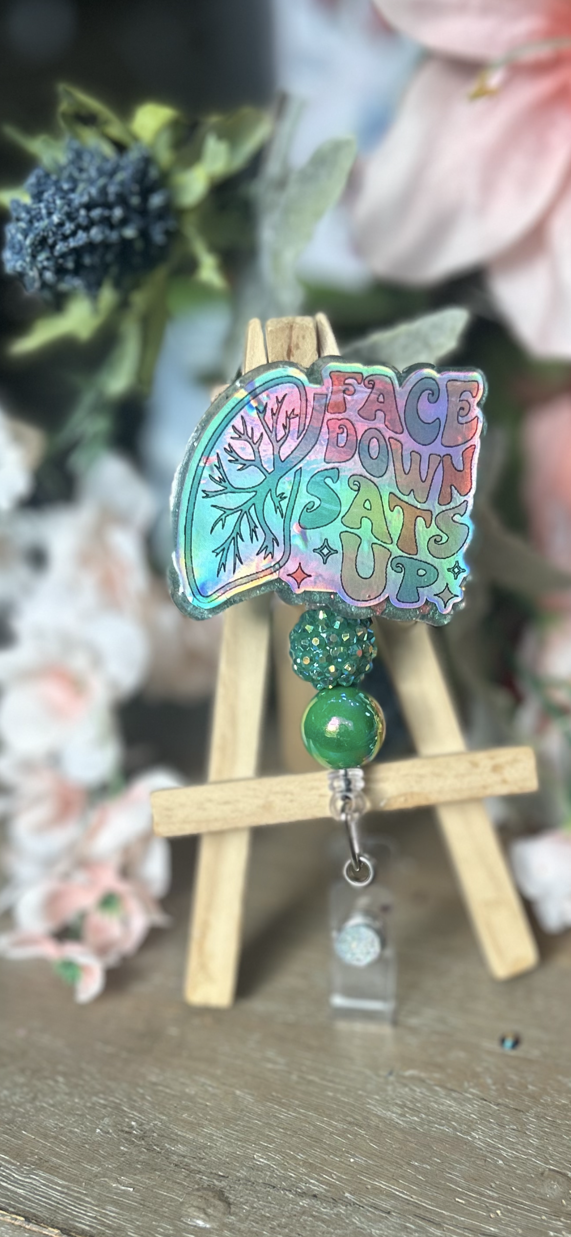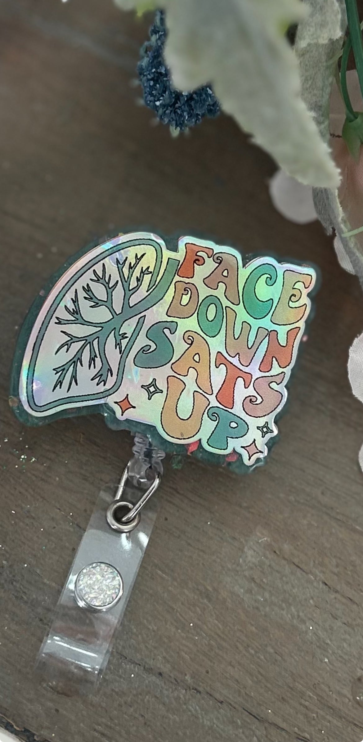 This holographic badge reel says it all: “Face Down, SATS Up”—a must-have for your ICU or respiratory shift!