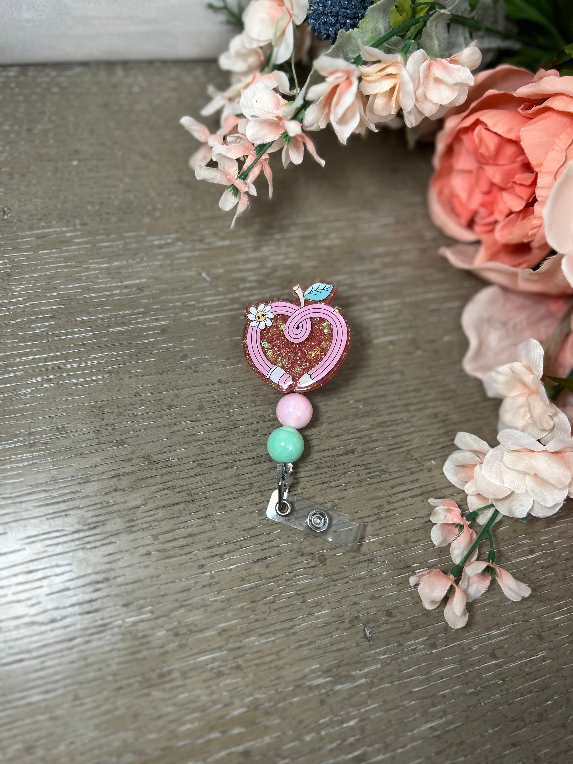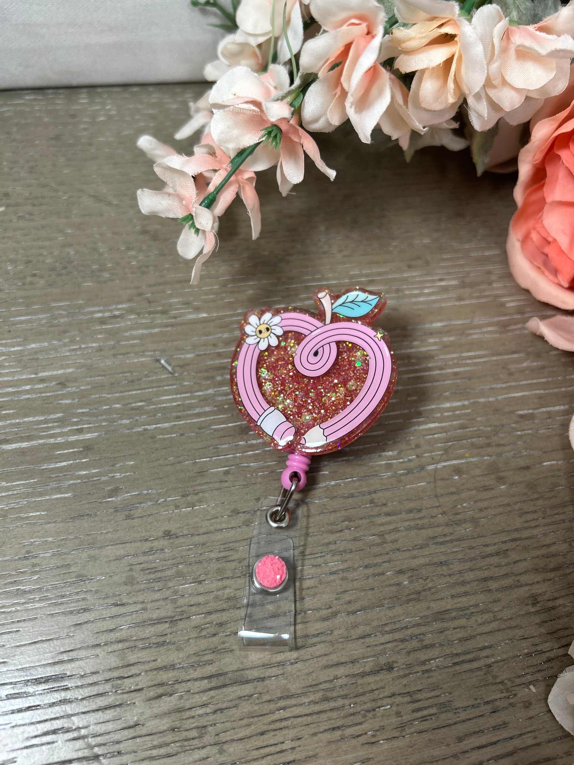 This glittery apple pencil badge reel is a sweet blend of cute and professional! Perfect for nurses, teachers, or school healthcare staff who love a little sparkle in their day. The coiled pencil forms a heart-shaped apple topped with a flower and leaf—adorable and meaningful!