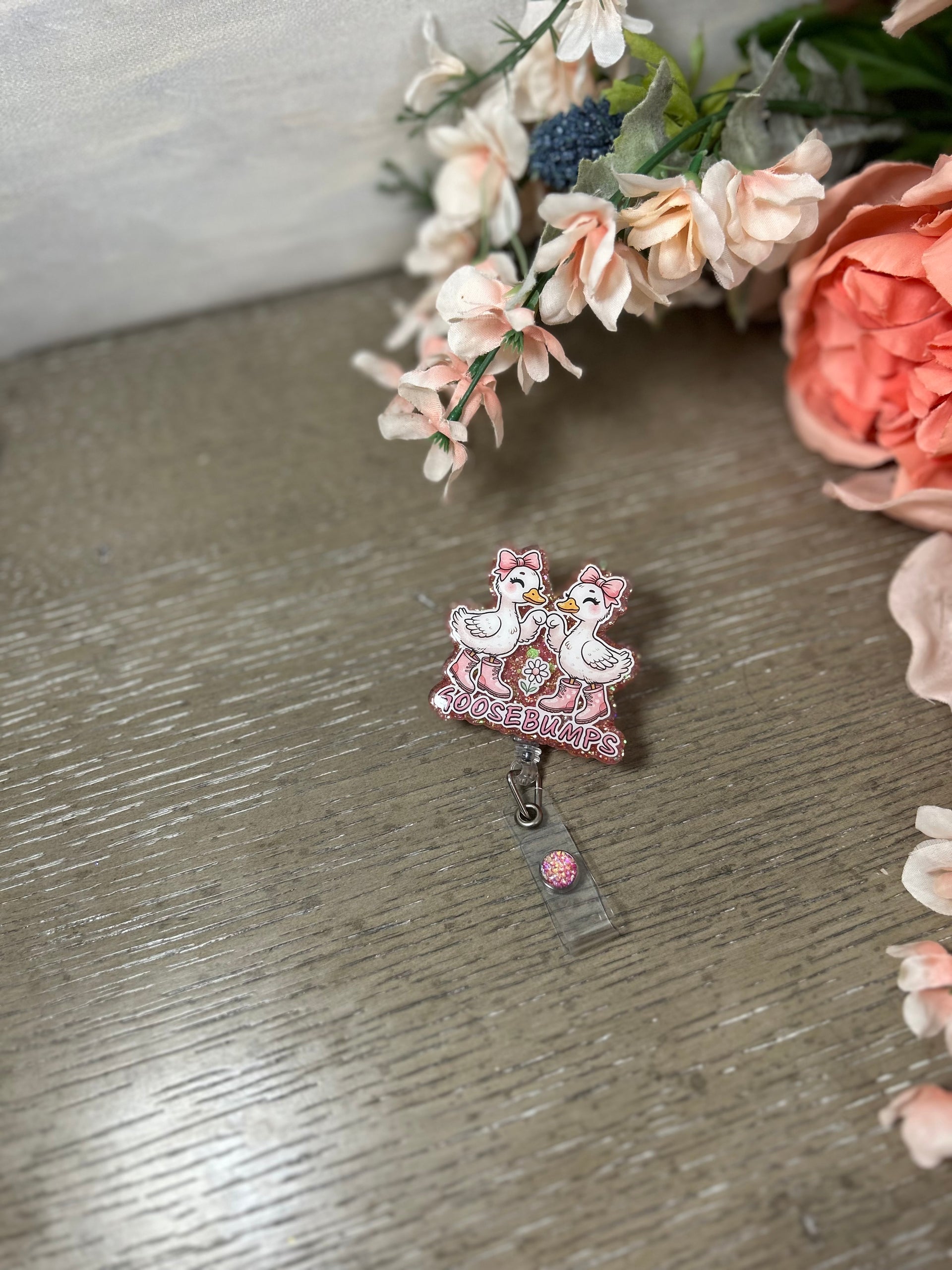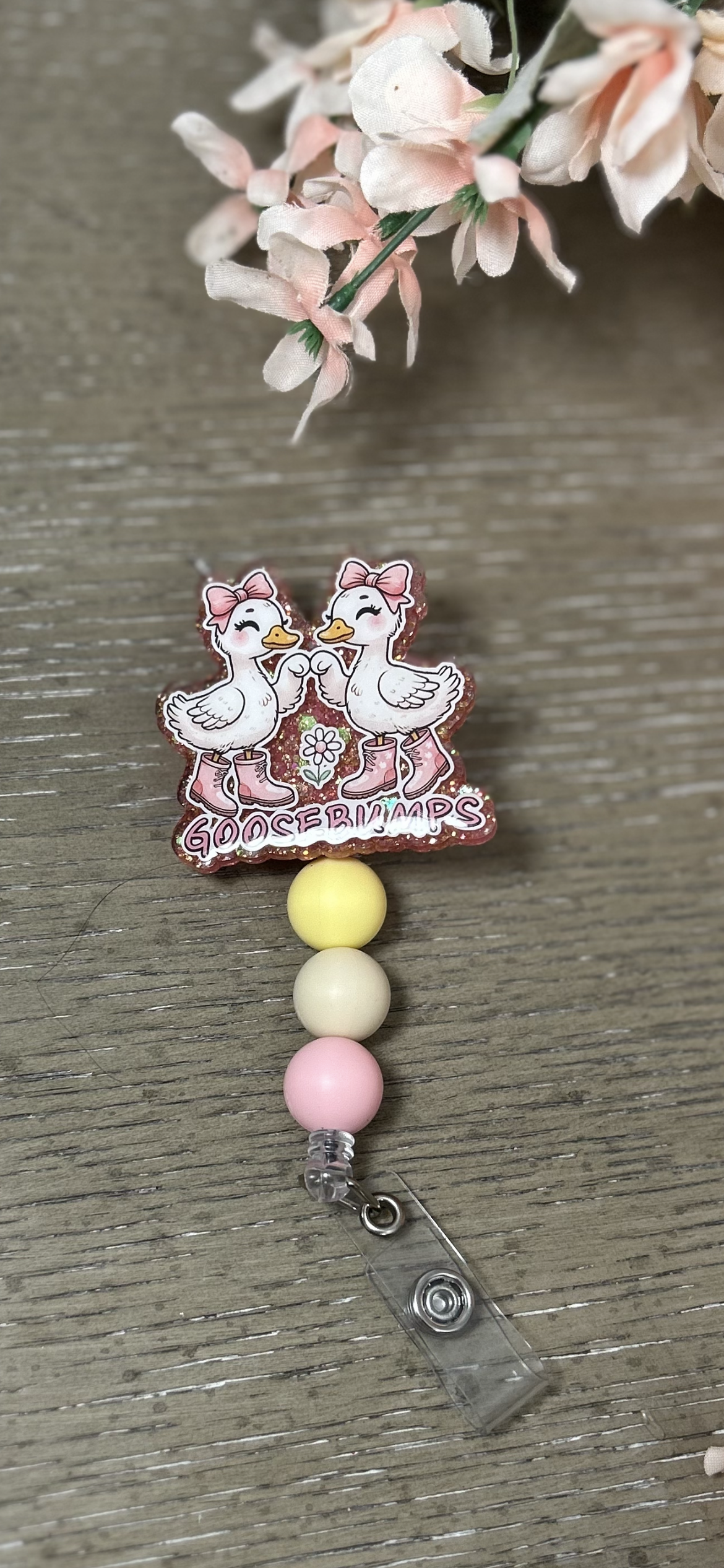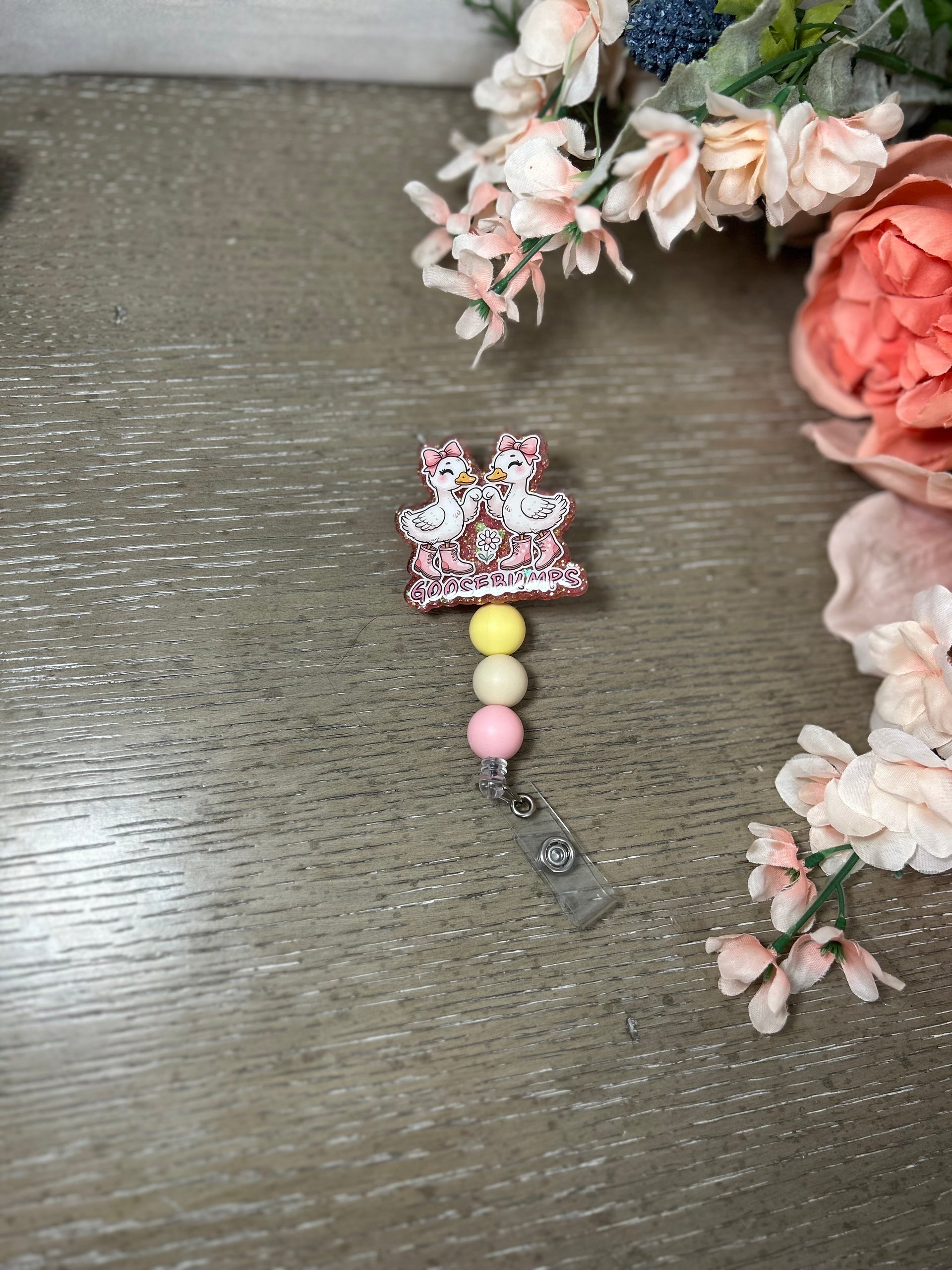 Bring some cozy cuteness to your badge with our Goosebumps duck reel! Featuring two stylish geese in boots and bows, this reel is a conversation starter. Add beads for a little sparkle or keep it sweet and simple.