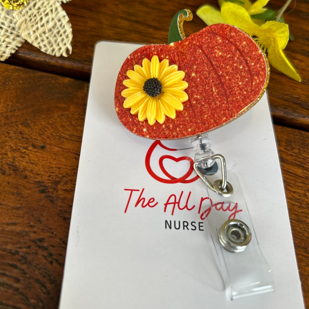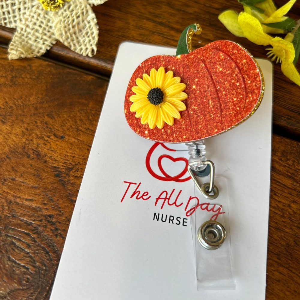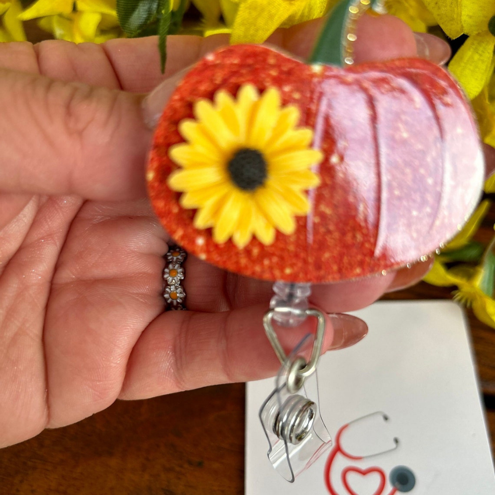 🎃🌻 Add a touch of autumn to your workday with our handcrafted Pumpkin with Sunflower Badge Reels! 🍂 Perfect for nurses, teachers, and students, these resin-crafted badge reels feature a delightful pumpkin adorned with a vibrant sunflower, making them the ideal fall accessory. 🌼