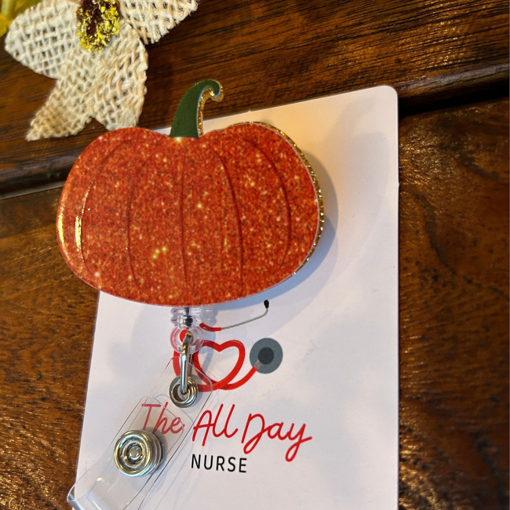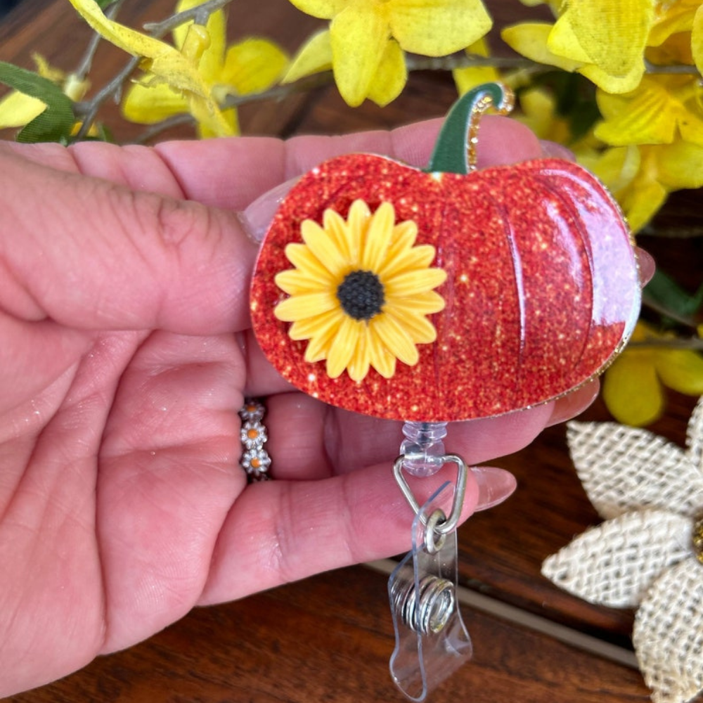 Celebrate the season in style—order your Pumpkin with Sunflower Badge Reel today! 🍂🎃
