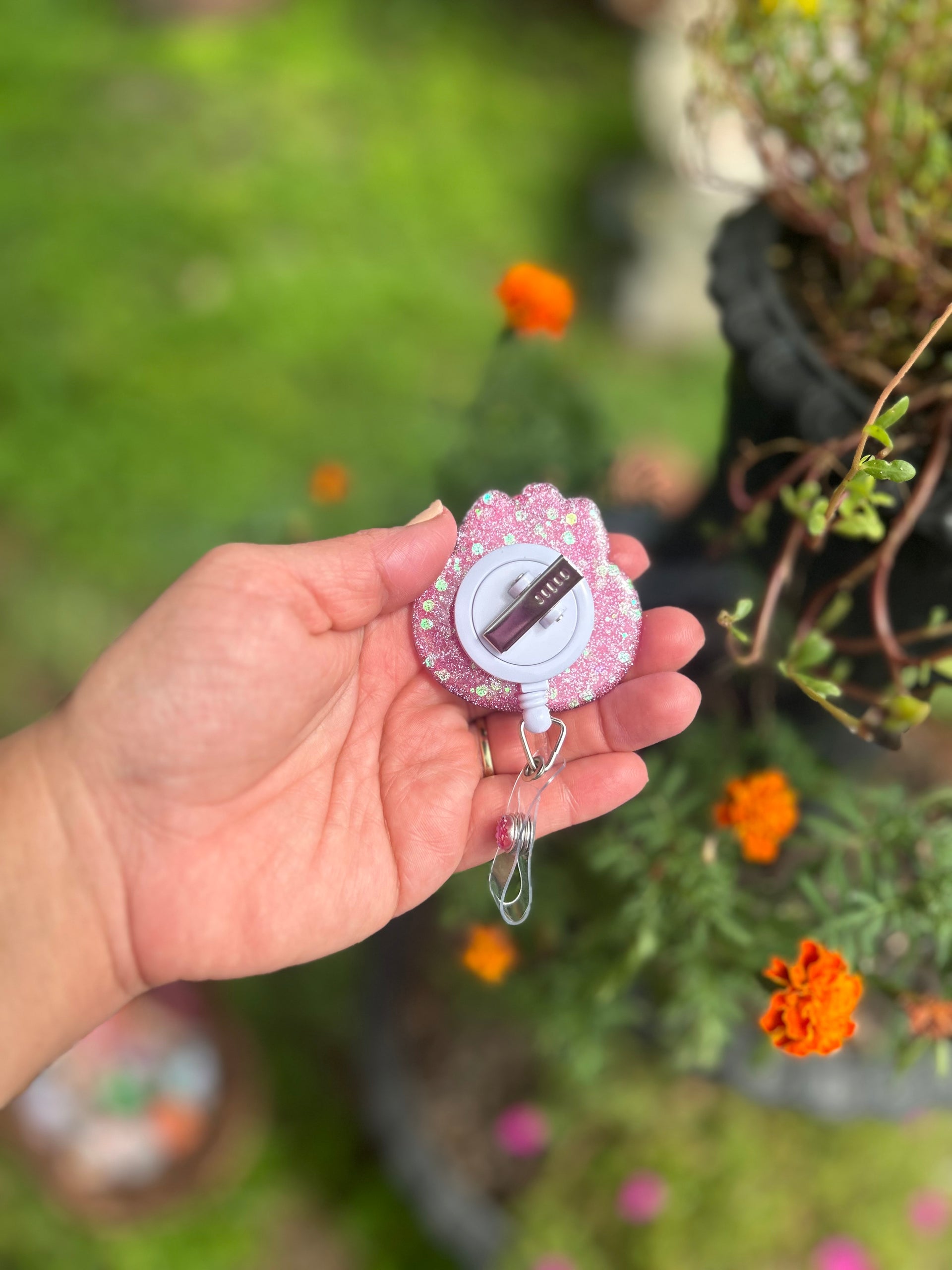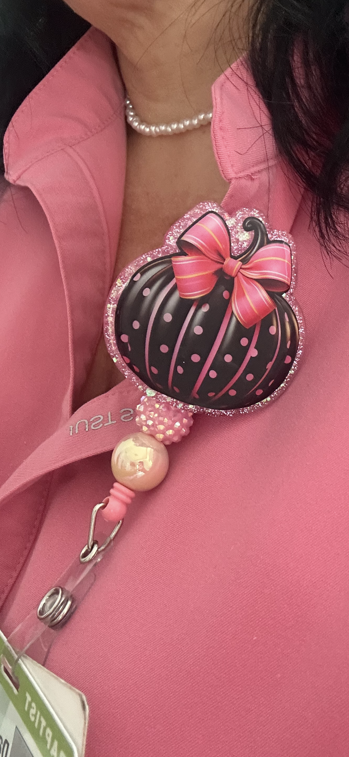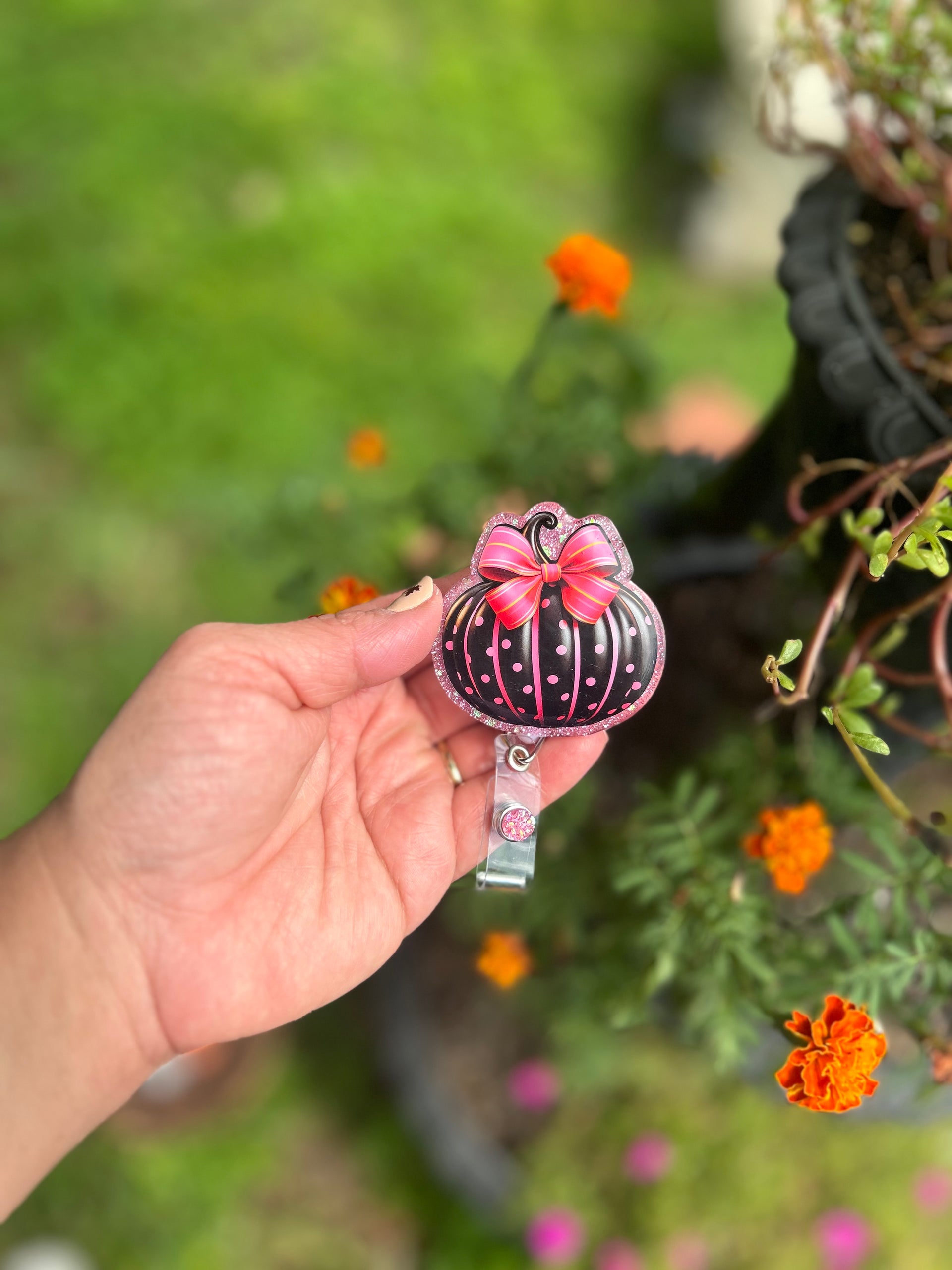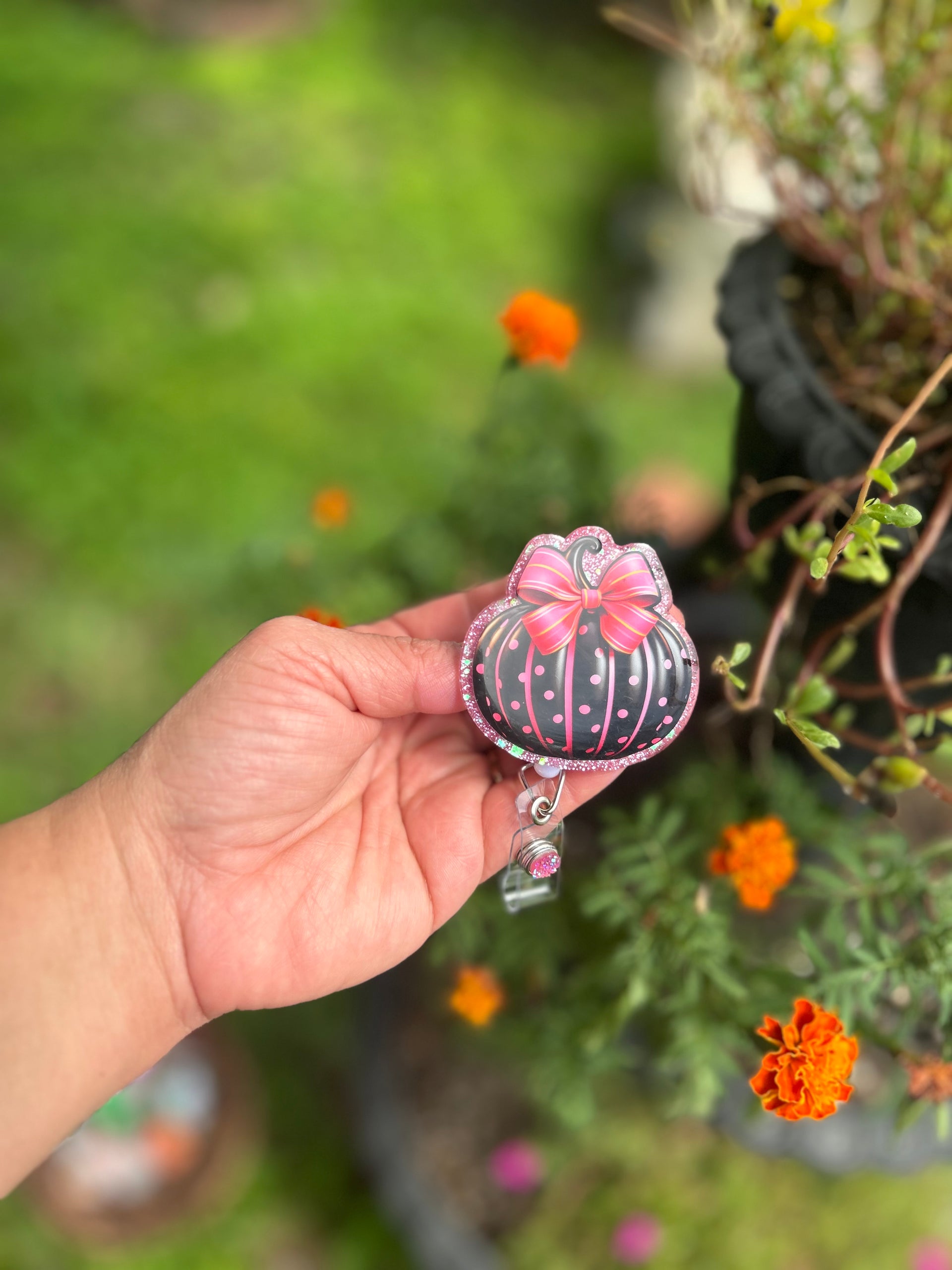 🎃✨ Introducing our adorable Pink Pumpkin badge reel, now with glitter accents for that perfect sparkle! ✨🎃