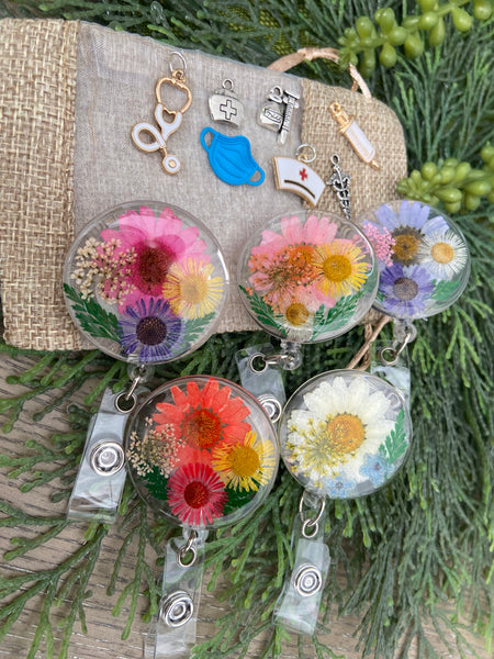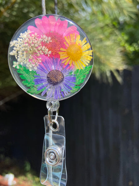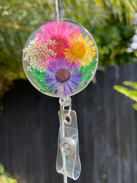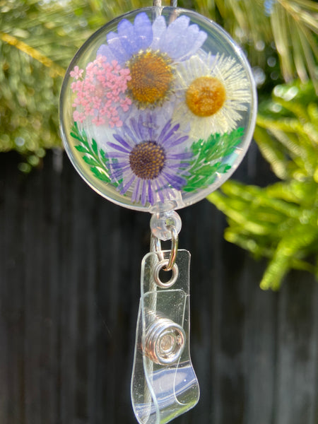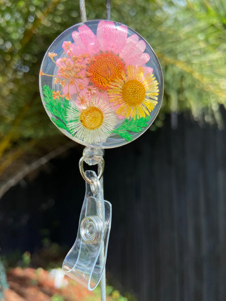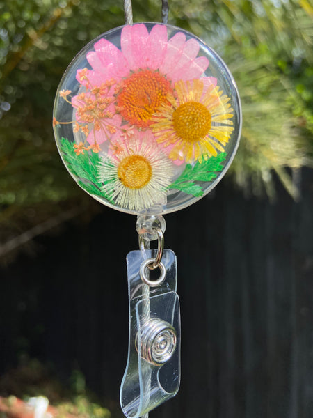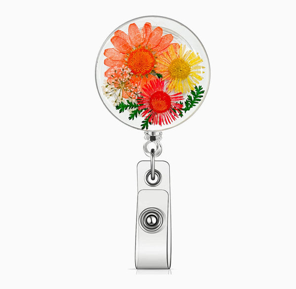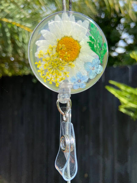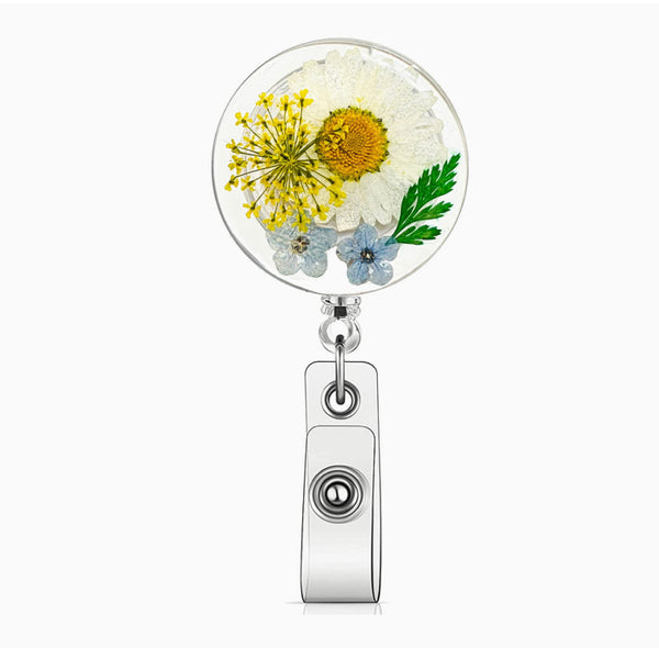 Resin Floral Badge Reel for Nurses, Dry Pressed Daisy Floral Badge Reel