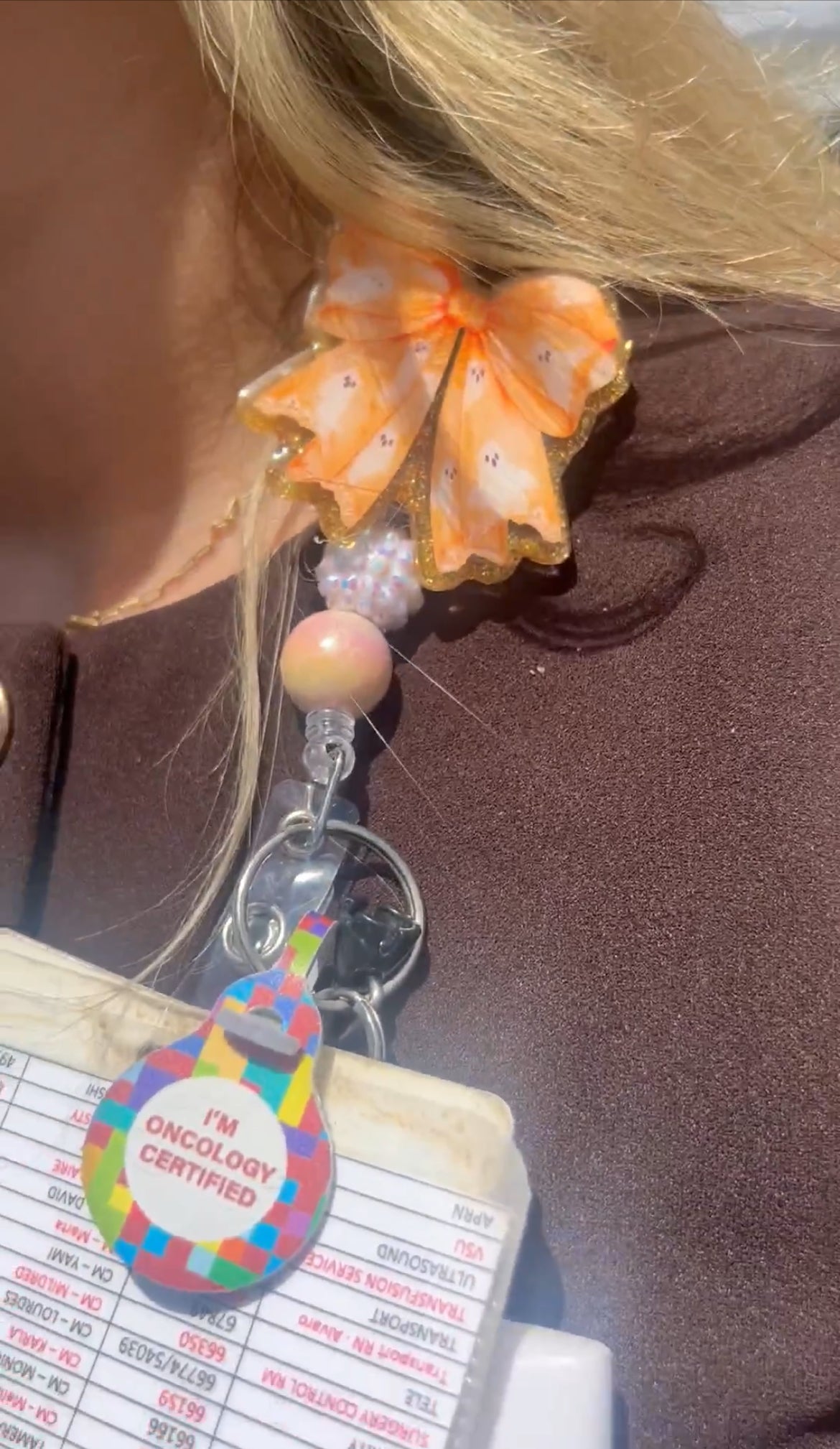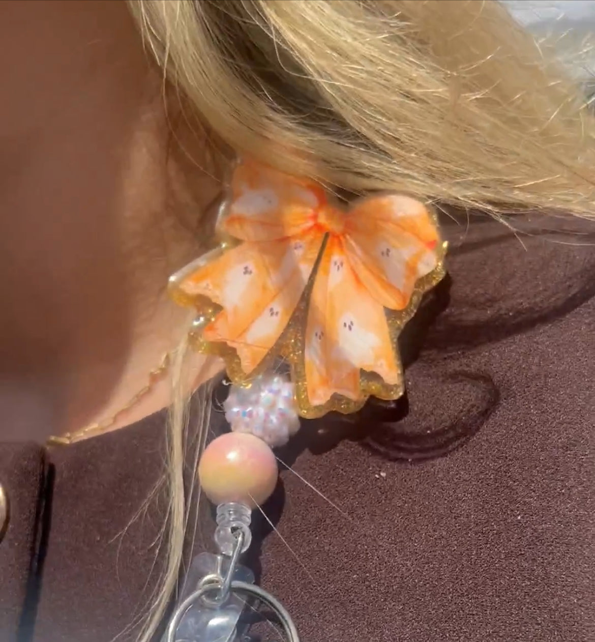 Cute + spooky 🎀👻 This orange bow covered in little ghosts is the perfect Halloween badge accessory. Add optional beads to make it shine even more!
