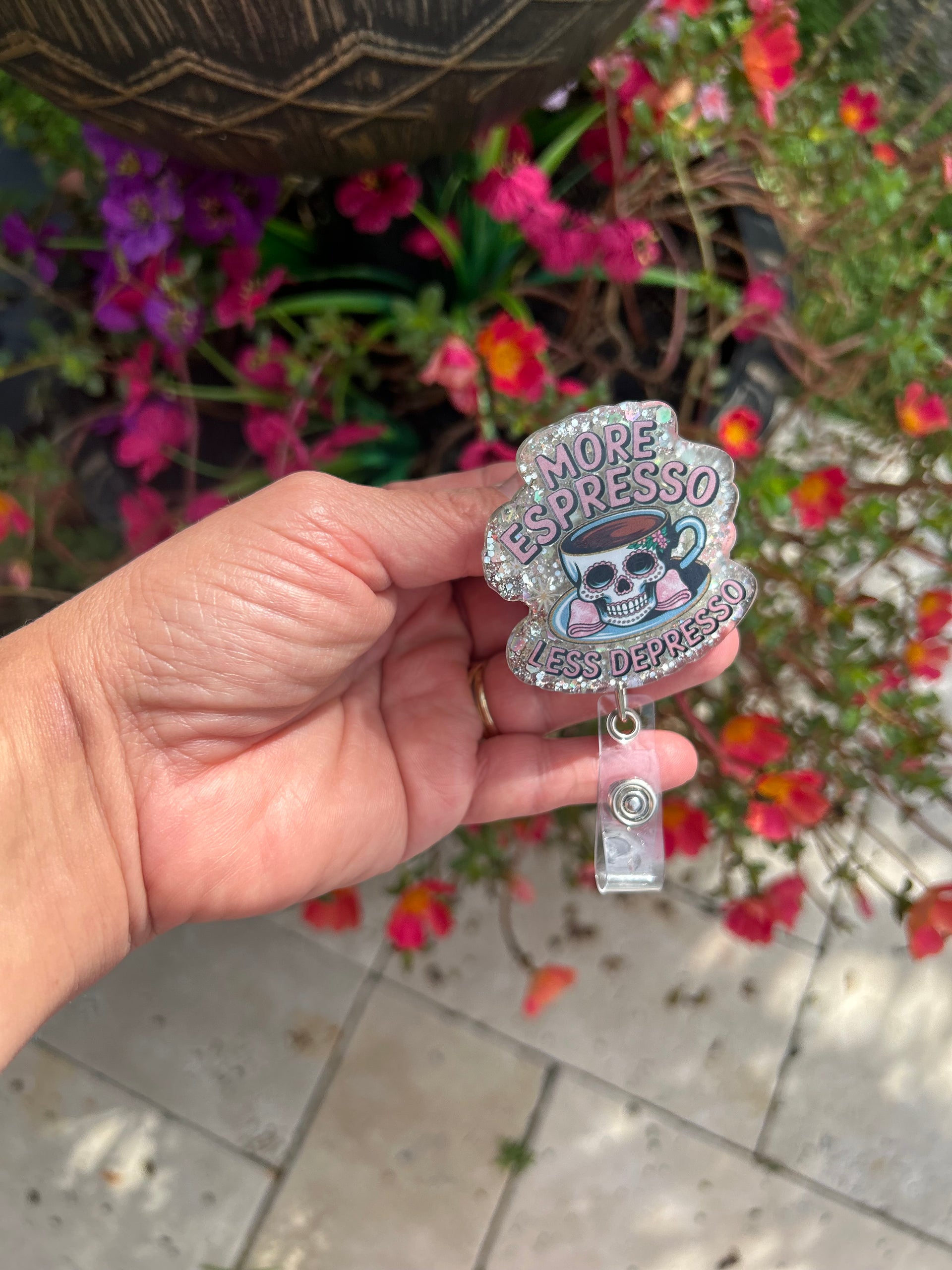 Coffee first, always ☕💀 This “More Espresso, Less Depresso” badge reel is the ultimate nurse mood booster.