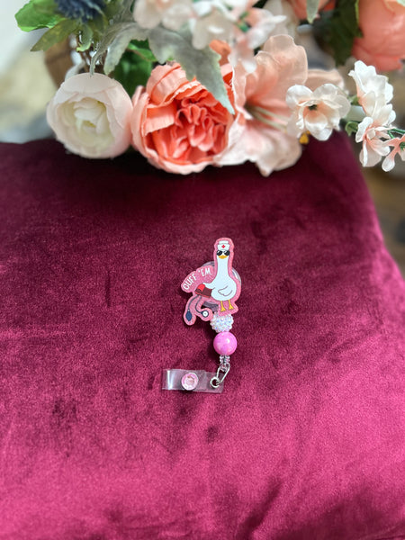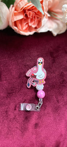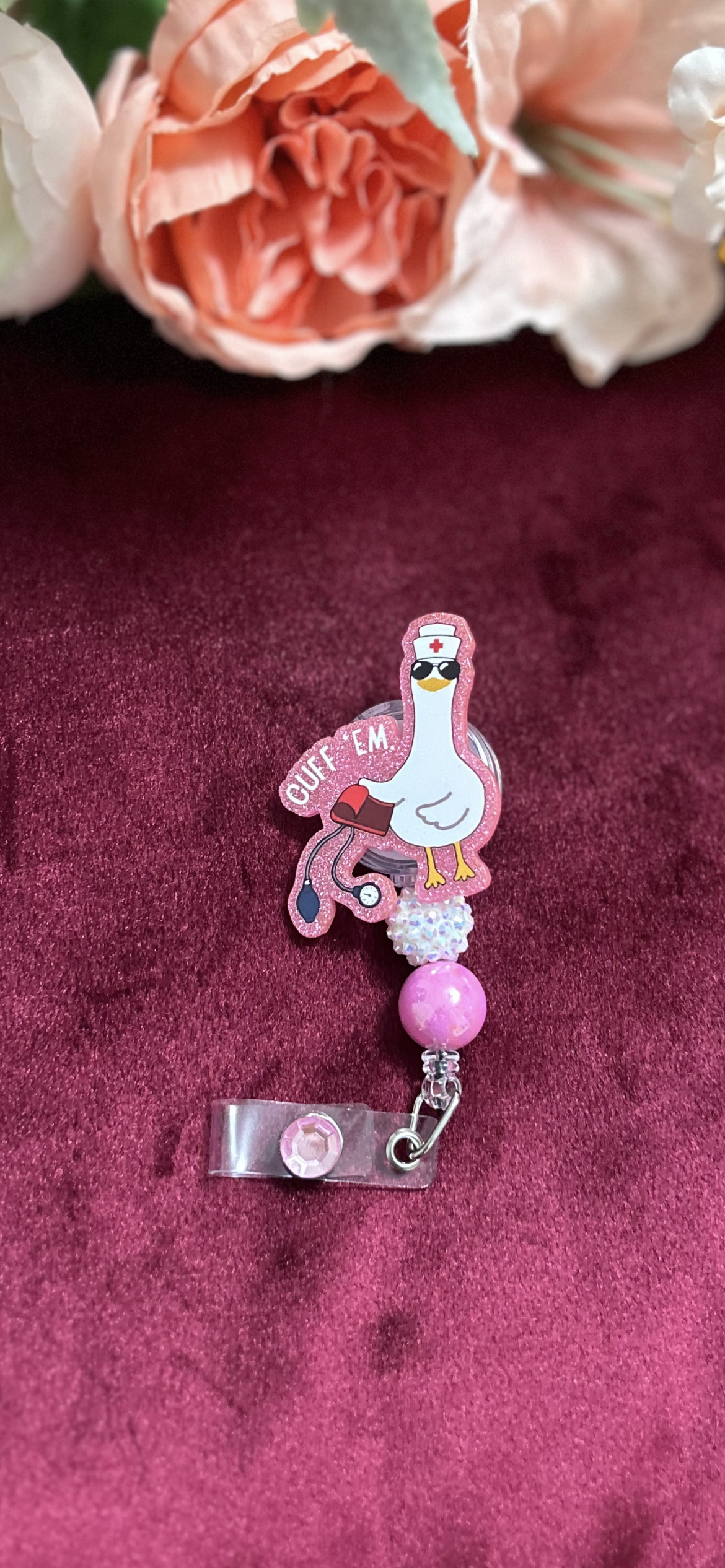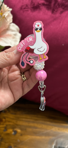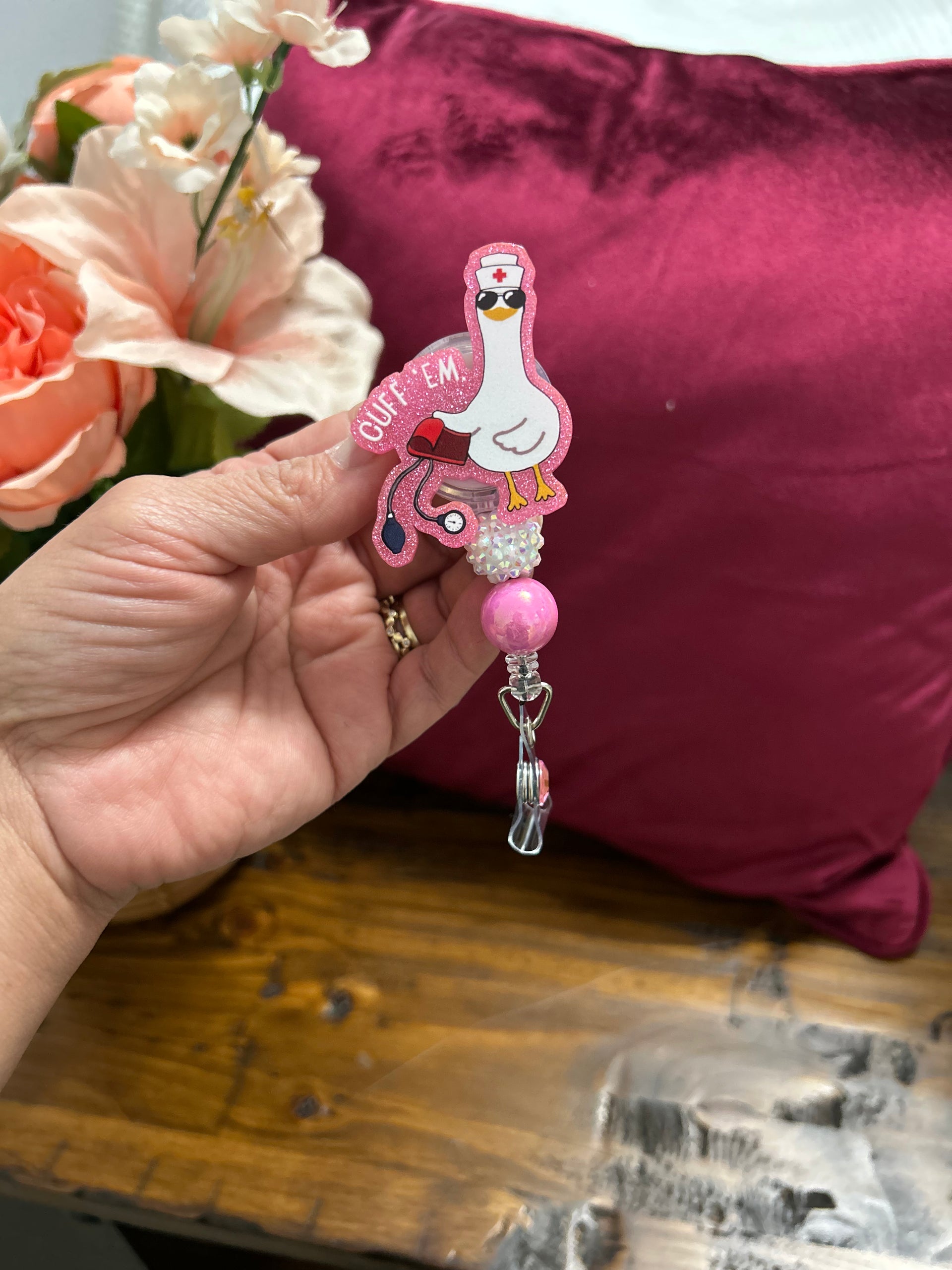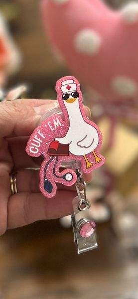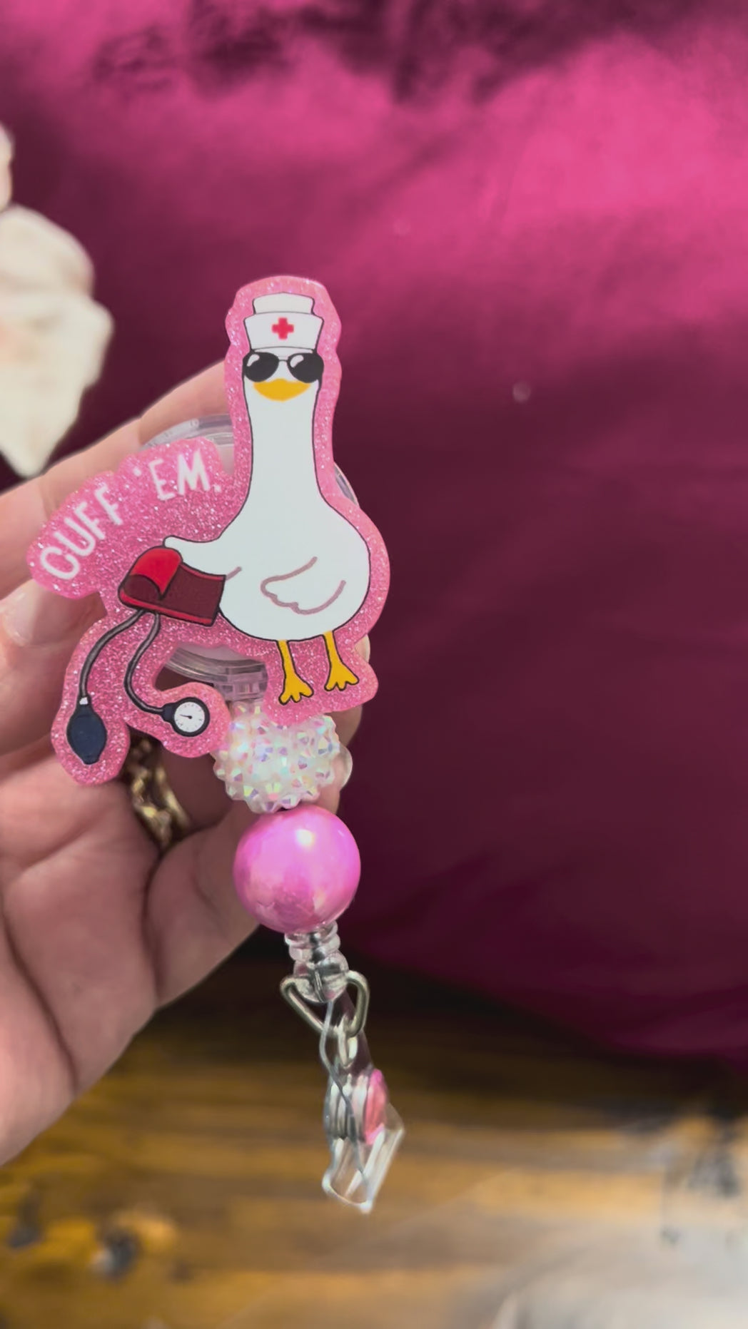 This “Cuff ’Em” nurse goose badge reel brings humor and personality to your shift. Featuring a bold goose in nurse mode with a blood pressure cuff, this badge is perfect for nurses who handle chaos with confidence and a sense of humor.