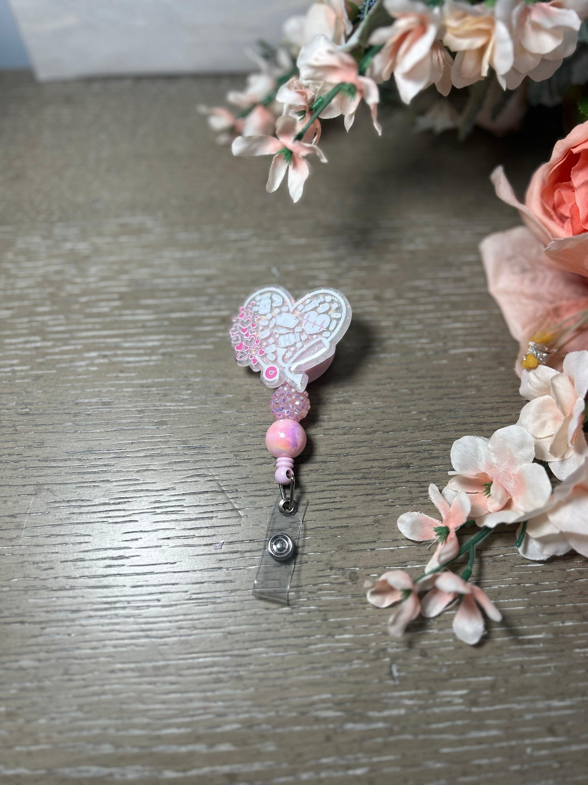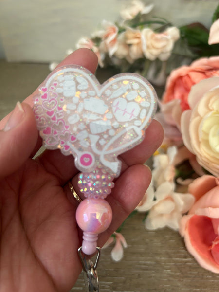 Add a touch of sparkle and sweetness to your everyday uniform with this handmade heart-shaped nurse badge reel!