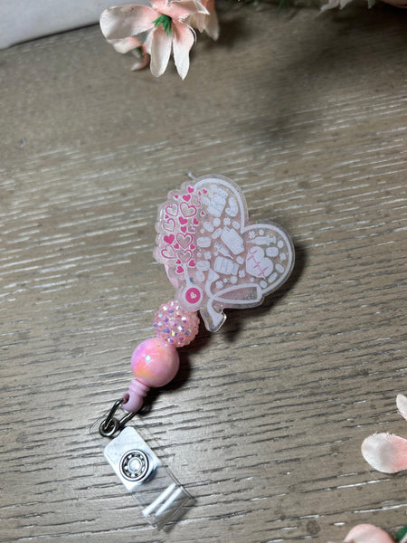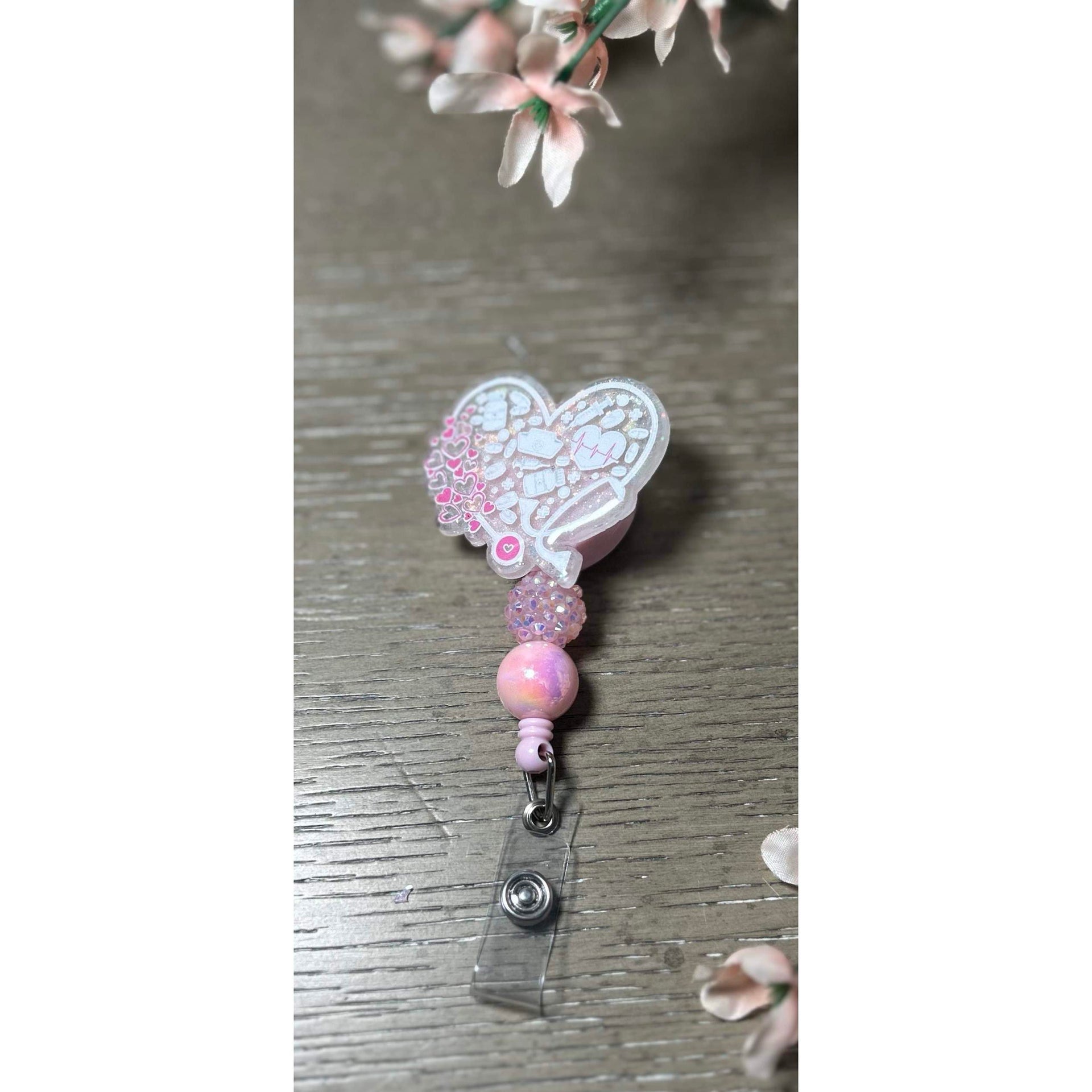 Crafted with love, this badge reel features a glittery pink and white heart design filled with adorable medical-themed icons—perfect for nurses, CNAs, techs, and anyone in healthcare. Accented with shimmering beads in pink and iridescent tones, it’s the ultimate blend of function and flair.