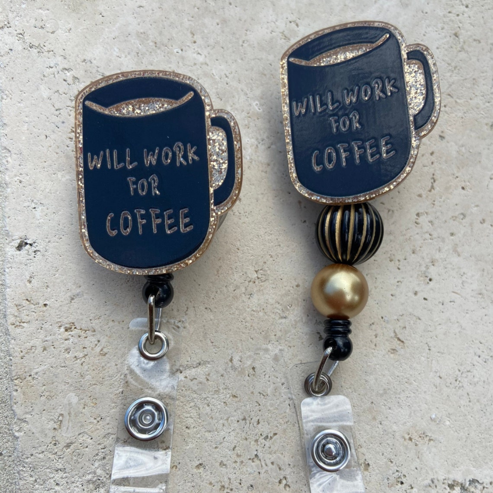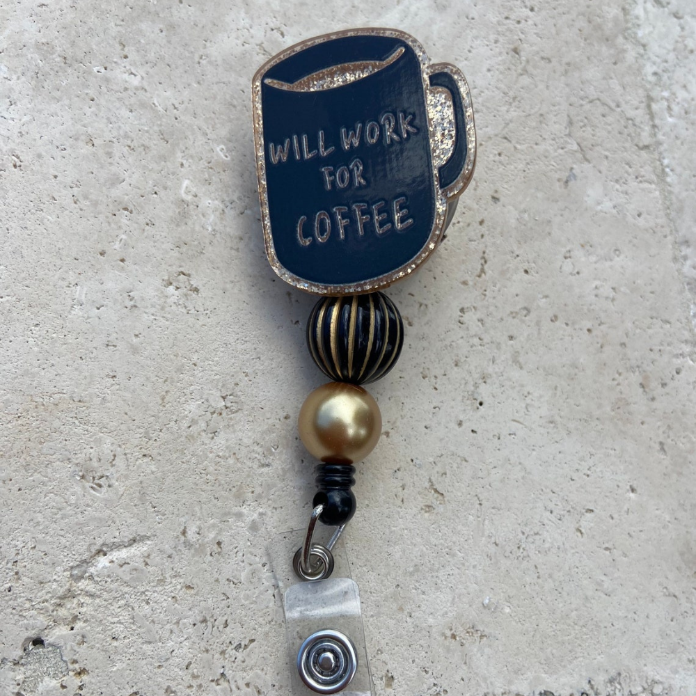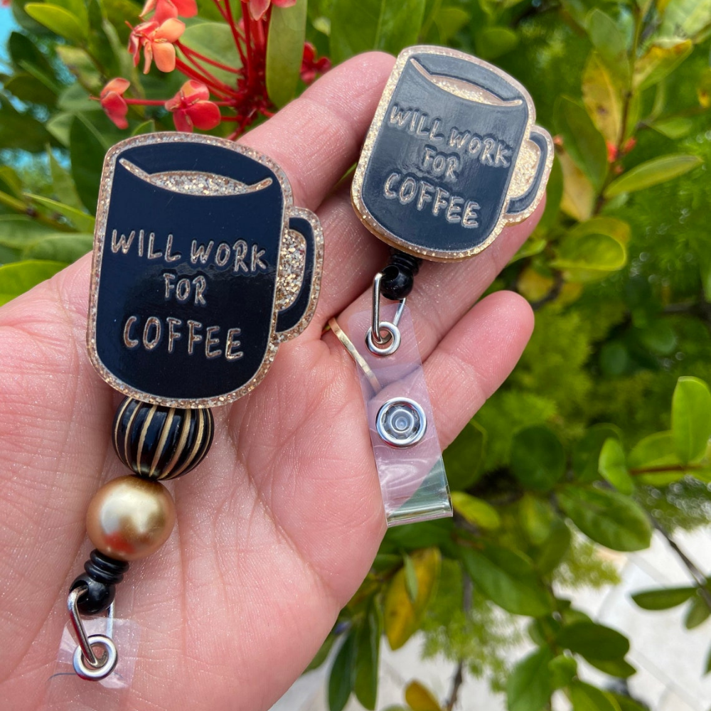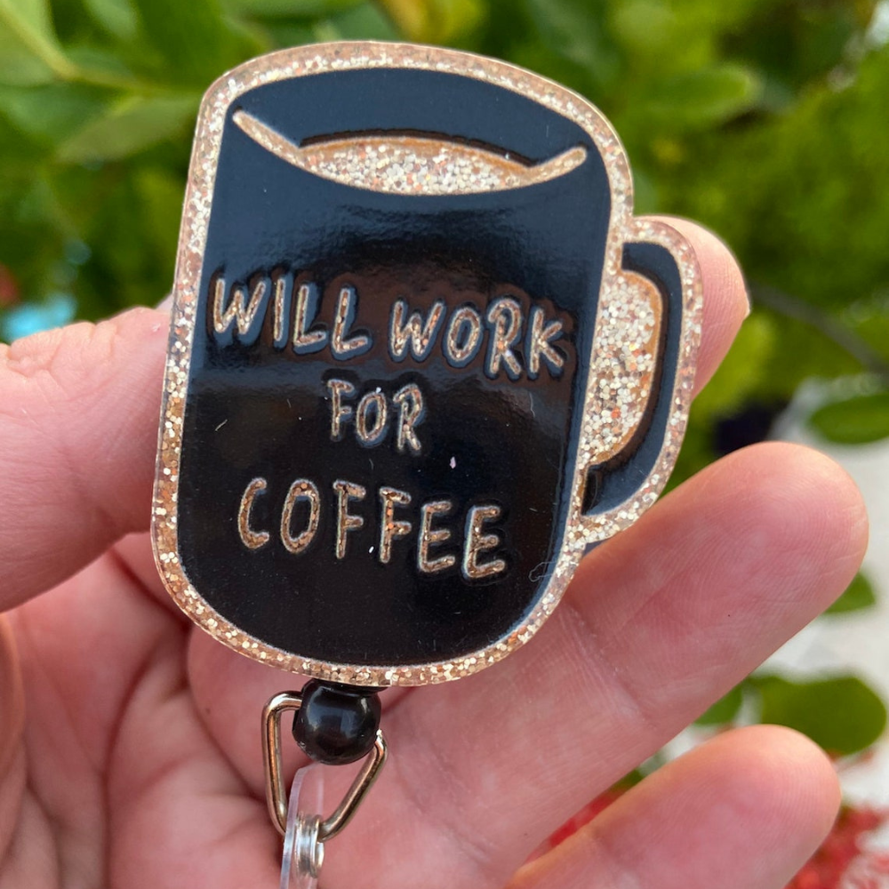Will Work for Coffee Badge Reel - Handmade Retractable ID Holder