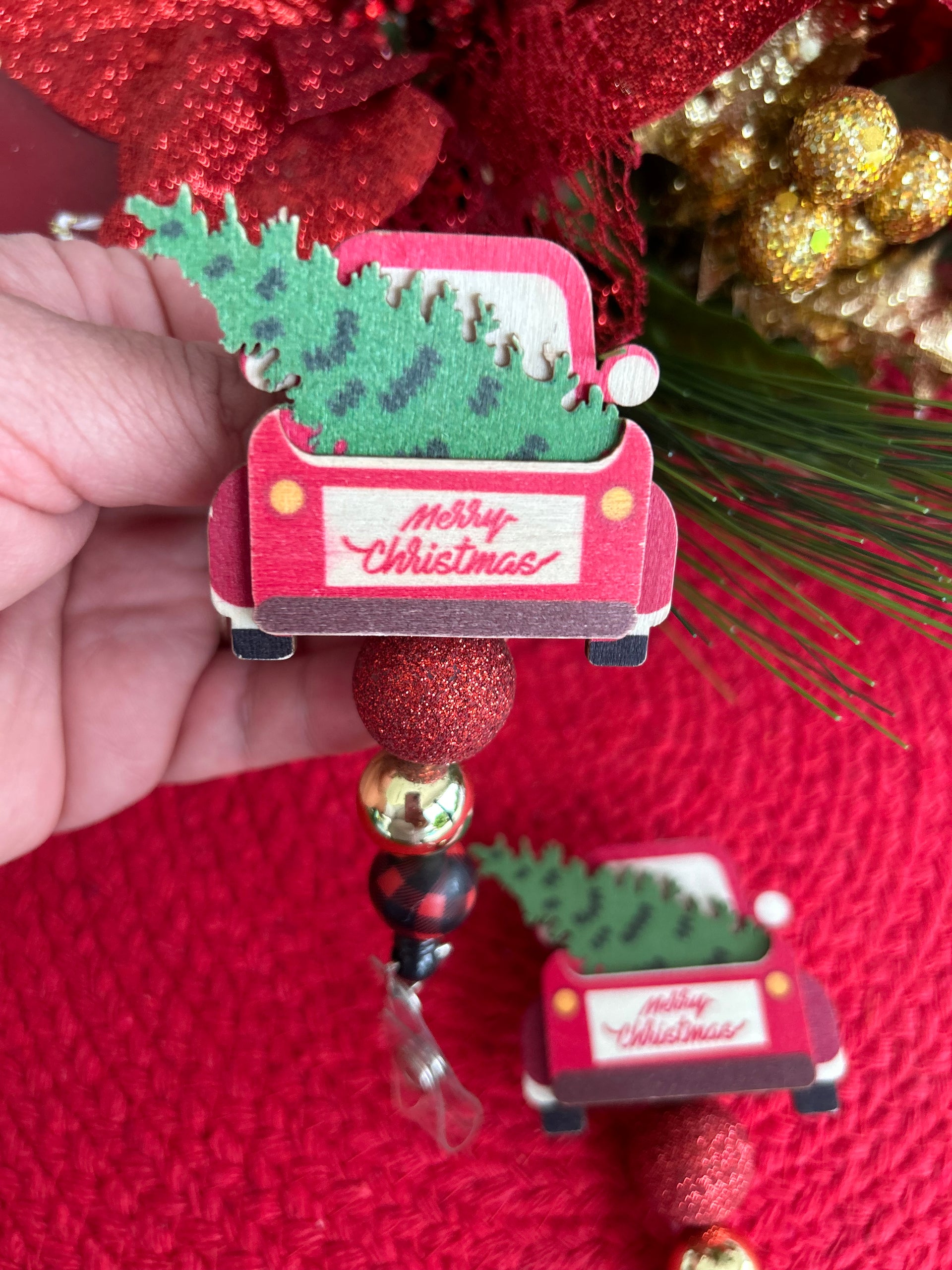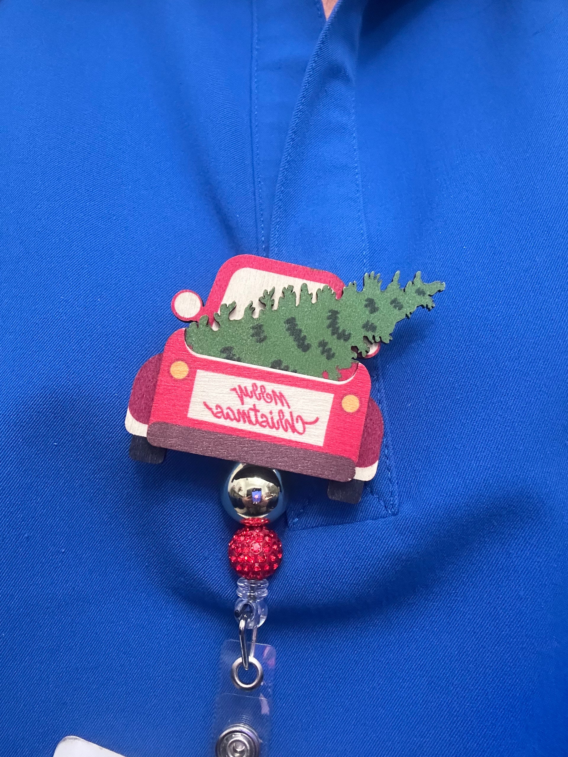 Wood Christmas Truck Badge Reel, Vintage Christmas Truck with Tree, Christmas Nurse ID Holder, Key Card, Medical Gift, Key Tag